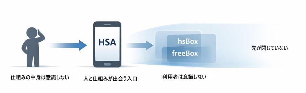 その裏側には、すでに稼働している実行基盤として hsBox や freeBox が存在しています。これらは、処理を実行し、状態を保ち、仕組みを継続させるための基盤です。HSA は、その上に新たな基盤を重ねるのではなく、既存の基盤と自然につながる入口として設計されています。この基盤の特徴は、利用者に見せることを目的としていない点にあります。