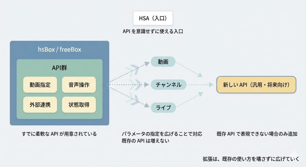 既存の呼び出しや動作を壊さずに、できることが増えること です。たとえば YouTube 連携を考えた場合でも、